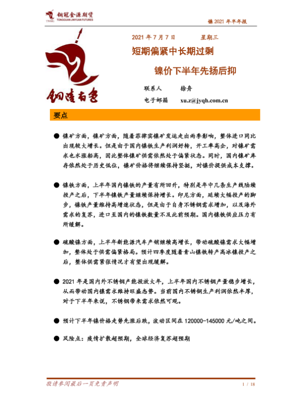 【铜冠金源期货】【20210707】镍2021年半年报:短期偏紧中长期过剩,镍价下半年先扬后抑-18页 行业研究