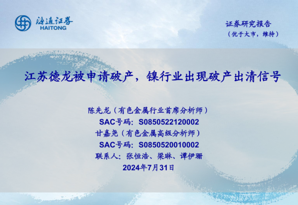 【海通证券】【20240731】江苏德龙被申请破产,镍行业出现破产出清信号-24页 行业研究