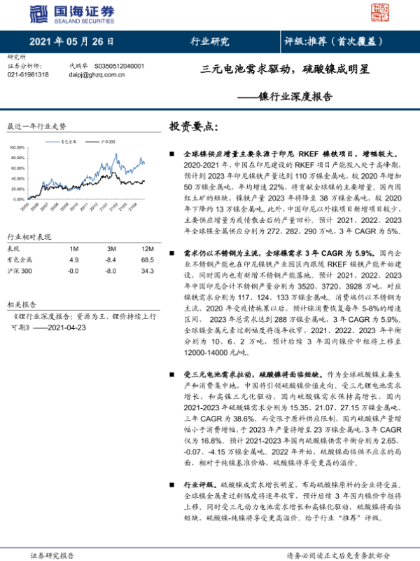 【国海证券】【20210526】镍行业深度报告:三元电池需求驱动,硫酸镍成明星-26页 行业研究