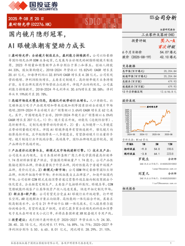 【国投证券】【202508】国内镜片隐形冠军,AI眼镜浪潮有望助力成长-39页 证券期货研究报告