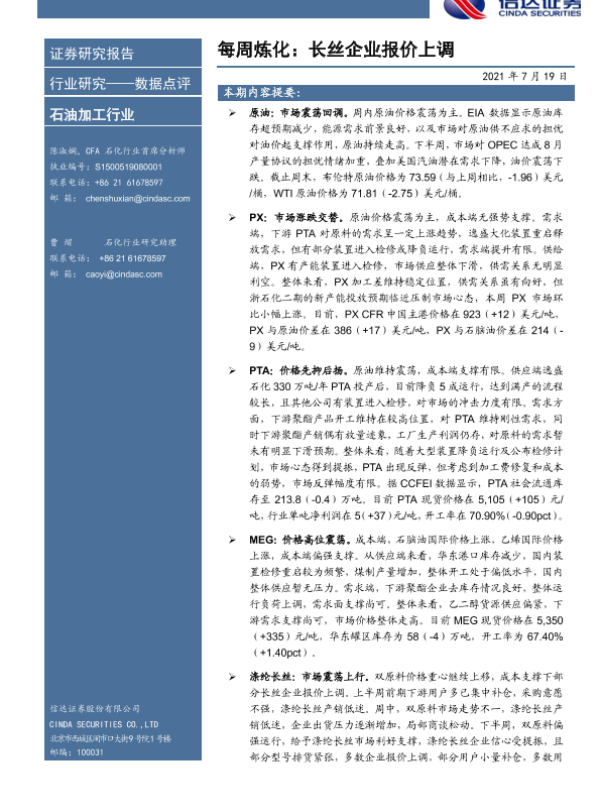【信达证券】【20210719】每周炼化:长丝企业报价上调-9页 行业研究
