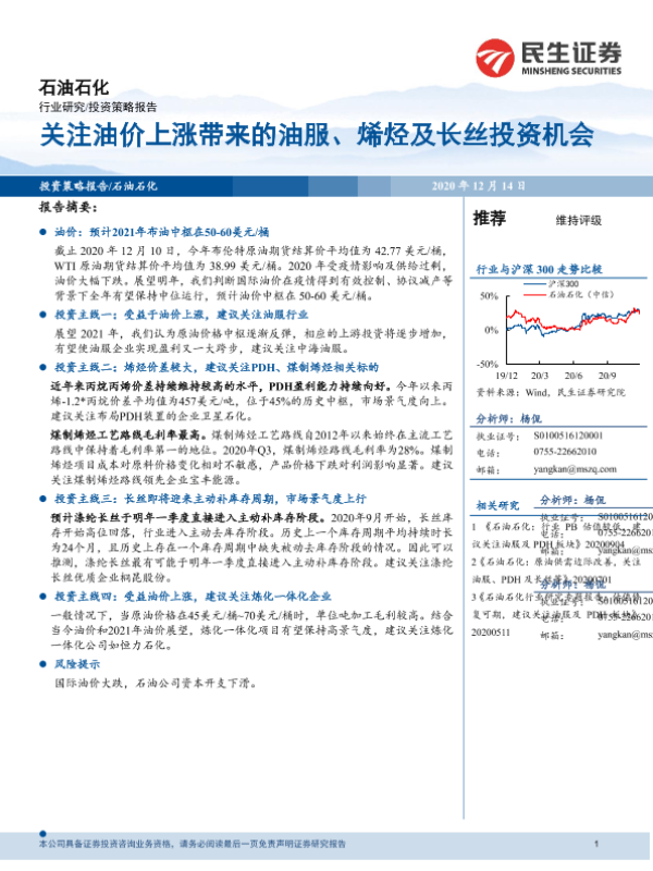 【民生证券】【20201214】石油石化投资策略报告:关注油价上涨带来的油服、烯烃及长丝投资机会-25页 行业研究