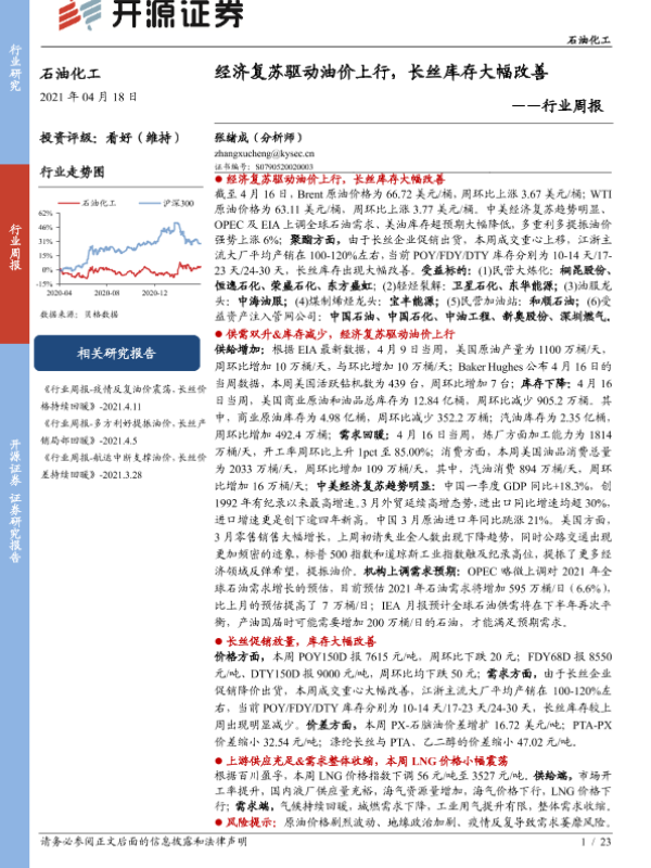 【开源证券】【20210418】石油化工行业周报:经济复苏驱动油价上行,长丝库存大幅改善-23页 行业研究