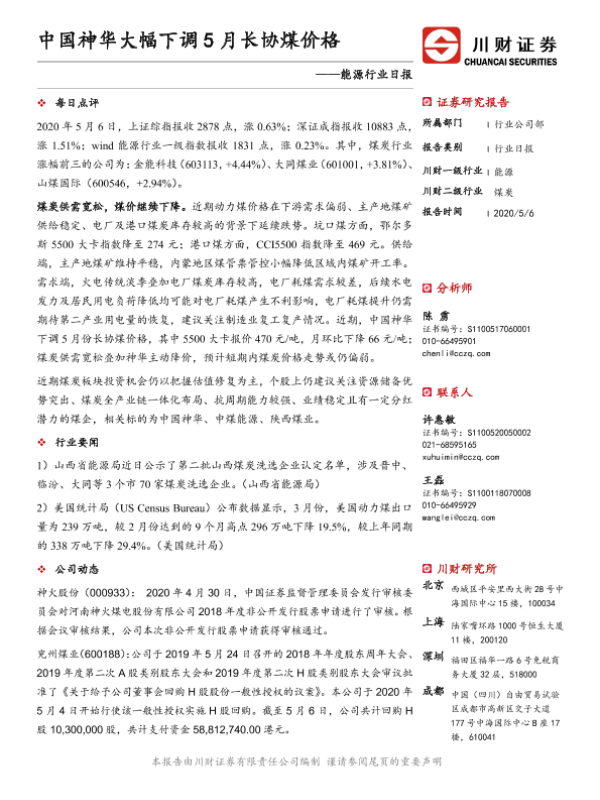 【川财证券】【20200506】能源行业日报:中国神华大幅下调5月长协煤价格-3页 证券期货研究报告