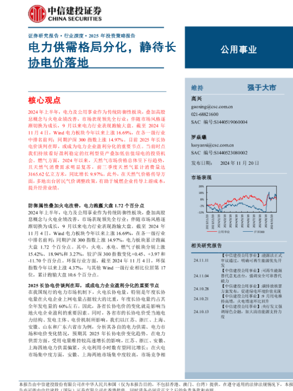 【中信建投证券】【20241120】2024年11月29日更新-【中信建投】公用事业行业:电力供需格局分化,静待长协电价落地-77页 行业研究