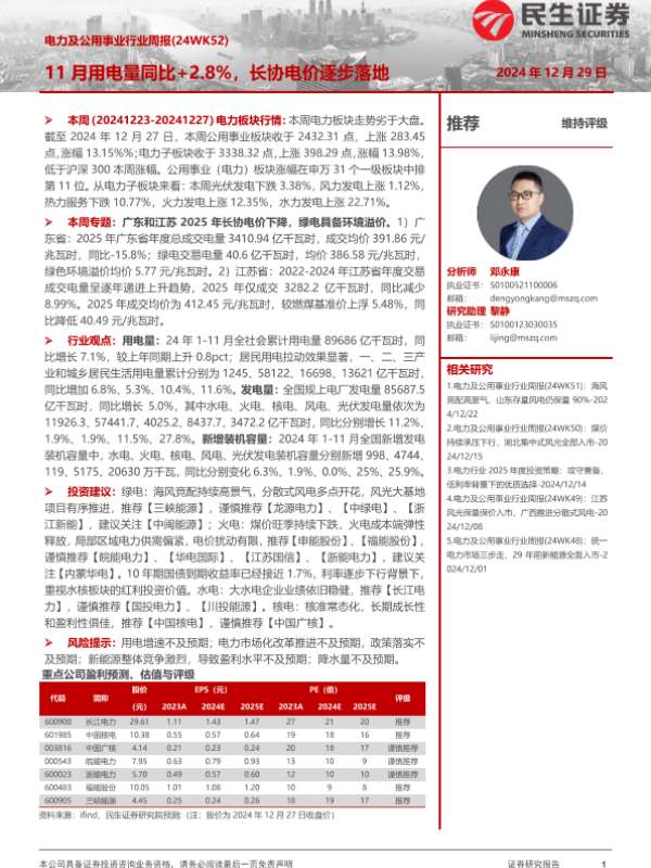 【民生证券】【20241229】电力及公用事业行业周报:11月用电量同比+2.8%,长协电价逐步落地-25页 行业研究