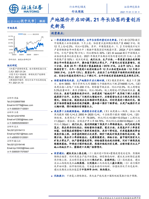 【海通证券】【20210131】20210131-海通证券-煤炭行业周报:产地煤价开启回调,21年长协签约量创历史新高-2页 行业研究
