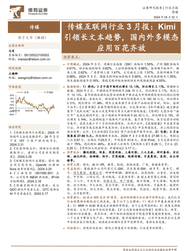 【德邦证券】【20240402】传媒互联网行业3月报:Kimi引领长文本趋势,国内外多模态应用百花齐放-13页 行业研究