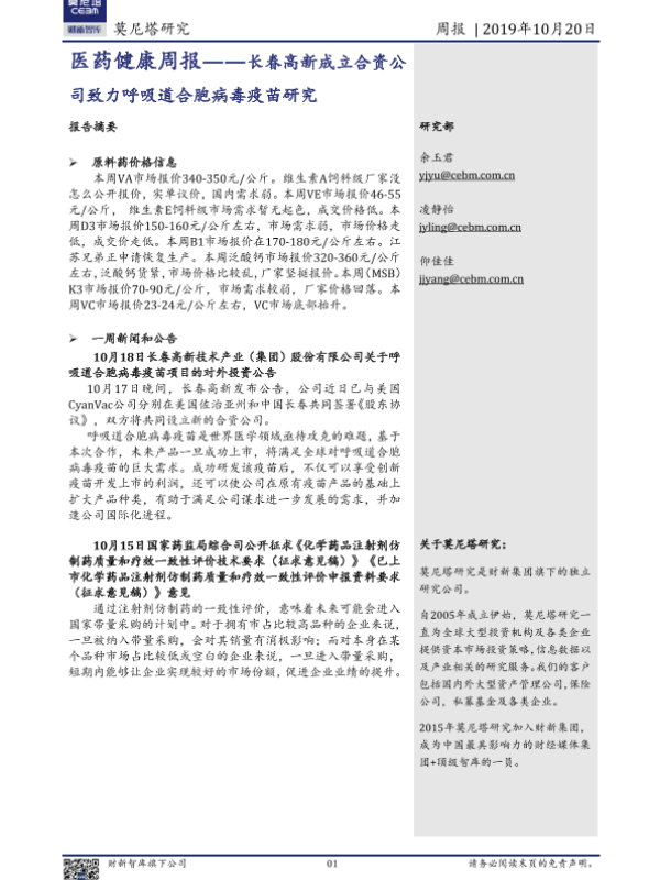【莫尼塔研究】【20191020】医药健康周报:长春高新成立合资公司致力呼吸道合胞病毒疫苗研究-11页 行业研究