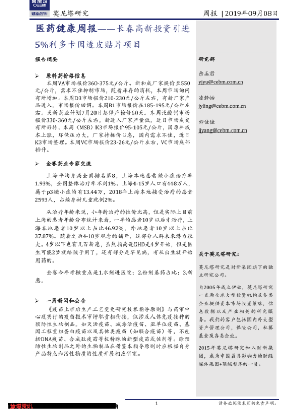 【莫尼塔研究】【20190908】医药健康周报:长春高新投资引进5%利多卡因透皮贴片项目-15页 行业研究