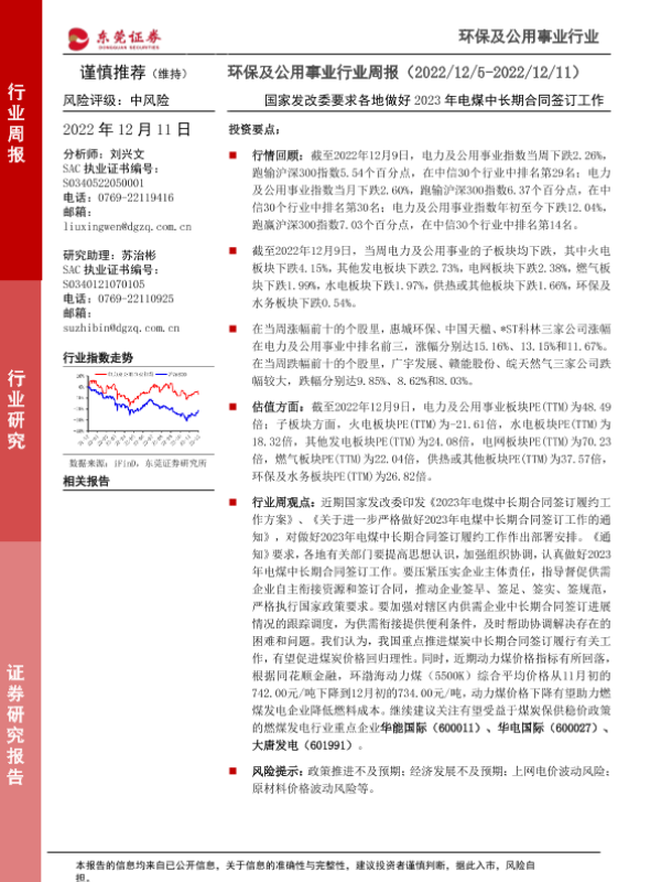 【东莞证券】【20221204】环保及公用事业行业周报:国家发改委印发《2023年电煤中长期合同签订履约工作方案》-12页 行业研究
