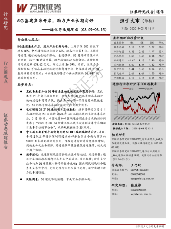 【万联证券】【20200316】20200316-万联证券-通信行业周观点:5G基建集采开启,助力产业长期向好-12页 行业研究