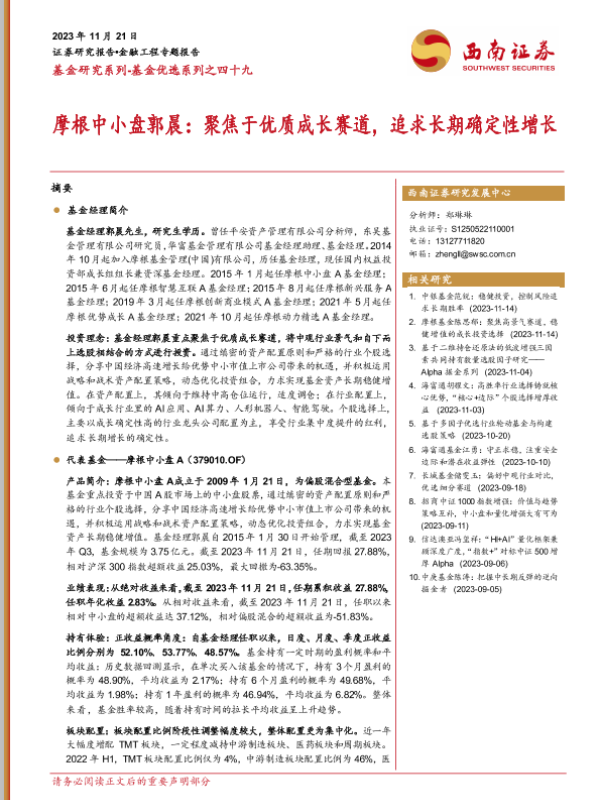 【西南证券】【20231121】基金研究系列-基金优选系列之四十九:摩根中小盘郭晨:聚焦于优质成长赛道,追求长期确定性增长-27页 行业研究
