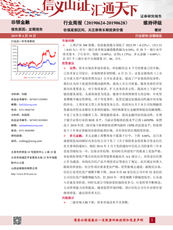 【山西证券】【20190630】非银金融行业周报:估值底部区间,关注券商长期投资价值-6页 行业研究
