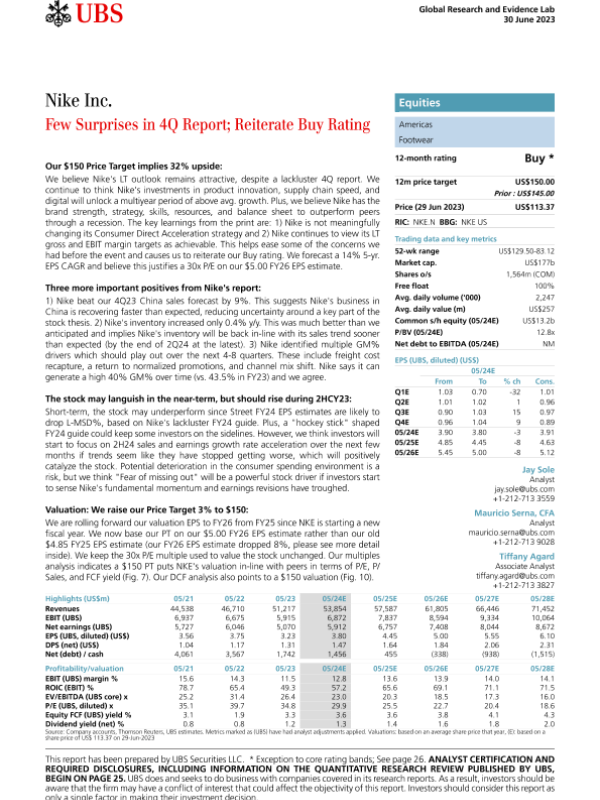 【UBS Securities LLC】【20230630】Nike Inc. - Few Surprises in 4Q Report; Reiterate Buy Rating-33页 行业研究