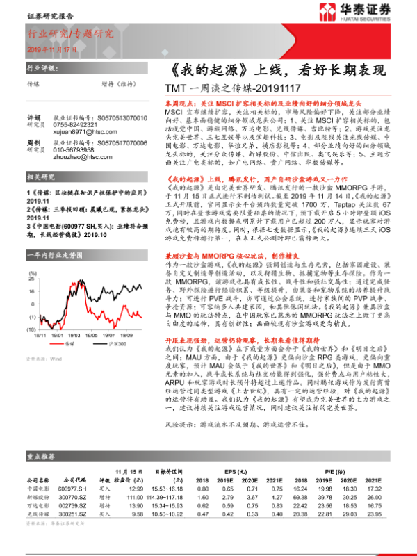 【华泰证券】【20191117】TMT一周谈之传:《我的起源》上线,看好长期表现-12页 行业研究