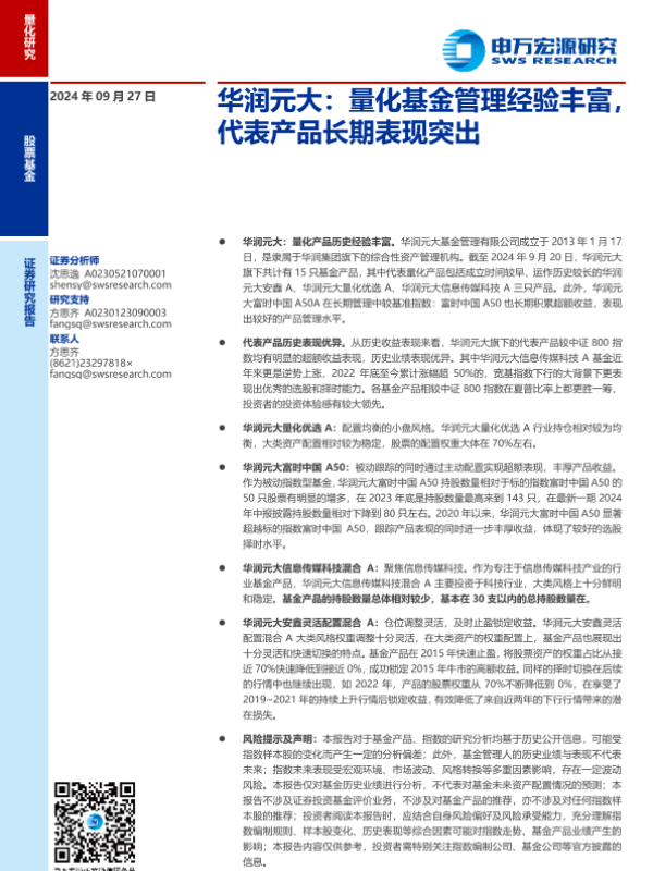 【申万宏源】【20240927】华润元大:量化基金管理经验丰富,代表产品长期表现突出-18页 行业研究