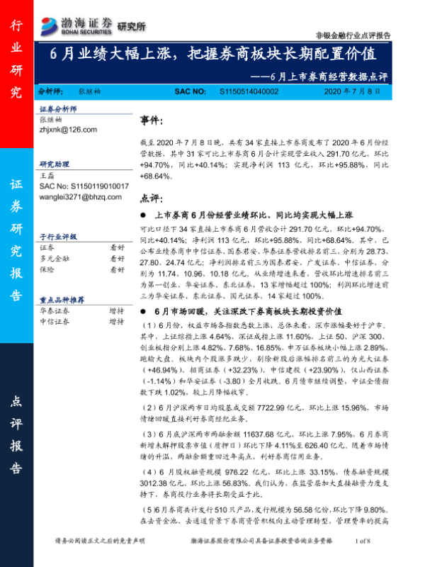 【渤海证券】【20200708】6月上市券商经营数据点评:6月业绩大幅上涨,把握券商板块长期配置价值-8页 行业研究
