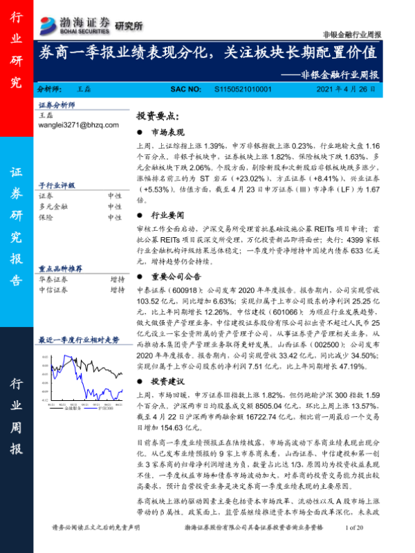 【渤海证券】【20210426】非银金融行业周报:券商一季报业绩表现分化,关注板块长期配置价值-20页 行业研究