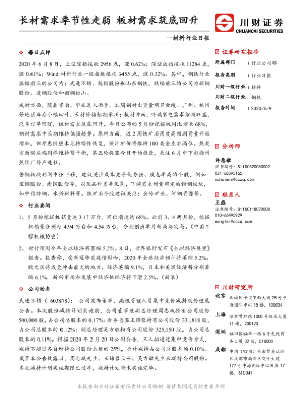 【川财证券】【20200609】材料行业日报:长材需求季节性走弱 板材需求筑底回升-3页 证券期货研究报告