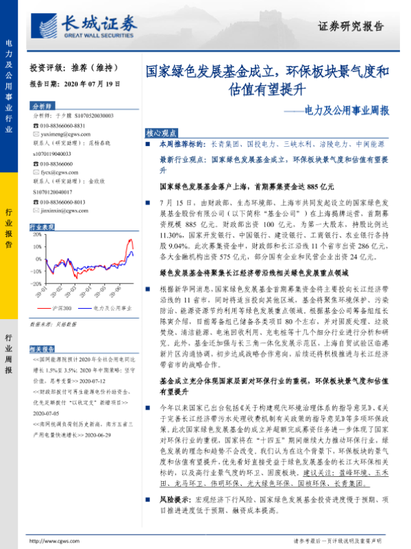 【长城证券】【20200719】电力及公用事业周报:国家绿色发展基金成立,环保板块景气度和估值有望提升-11页 行业研究