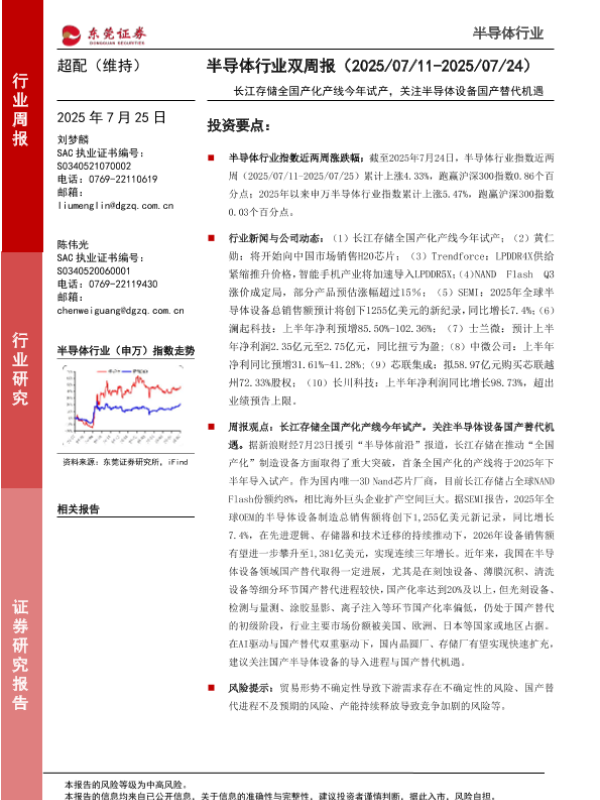 【东莞证券】【20250725】半导体行业双周报:长江存储全国产化产线今年试产,关注半导体设备国产替代机遇-15页 证券期货研究报告