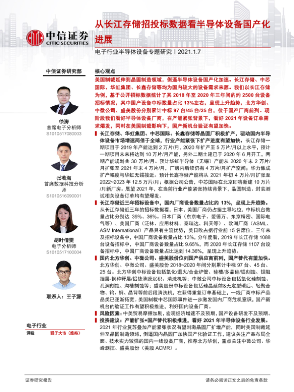 【中信证券】【20210107】从长江存储招投标数据看半导体设备国产化进展-9页 行业研究