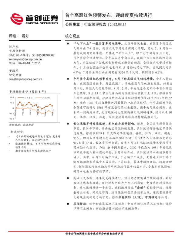 【首创证券】【20220815】首个高温红色预警发布,迎峰度夏持续进行-12页 行业研究