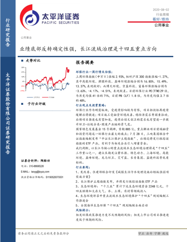 【太平洋证券】【20200802】公用事业行业周报:业绩底部反转确定性强,长江流域治理是十四五重点方向-11页 行业研究