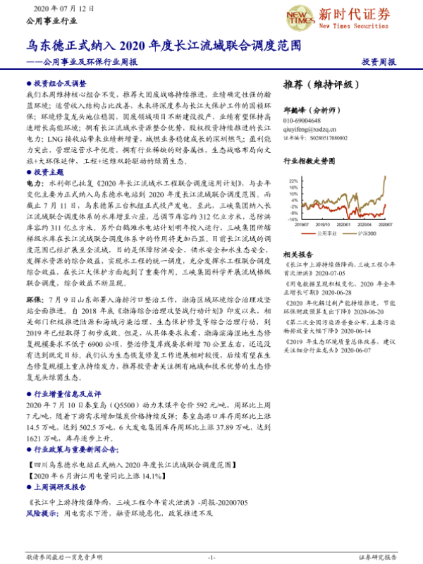 【新时代证券】【20200712】新时代证券公用事业及环保行业周报:乌东德正式纳入2020年度长江流域联合调度范围-18页 行业研究