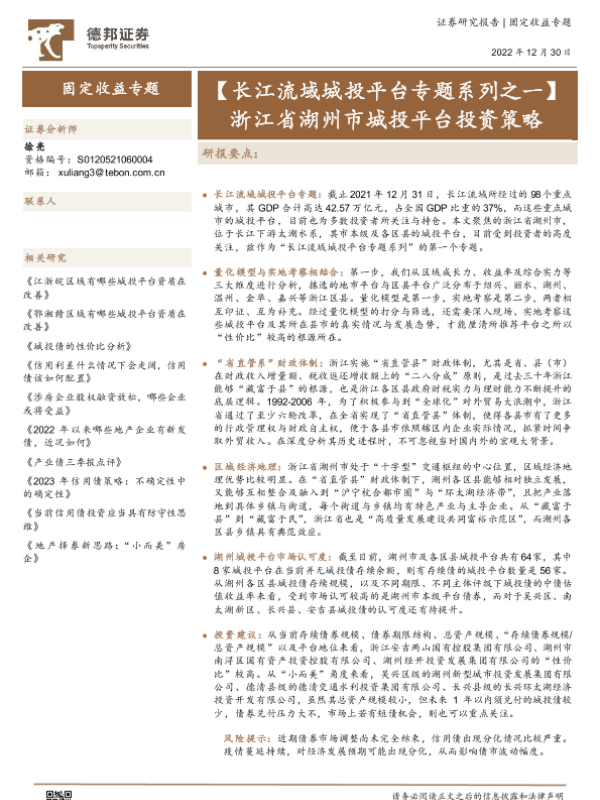 【德邦证券】【20221230】【长江流域城投平台专题系列之一】浙江省湖州市城投平台投资策略-51页 行业研究