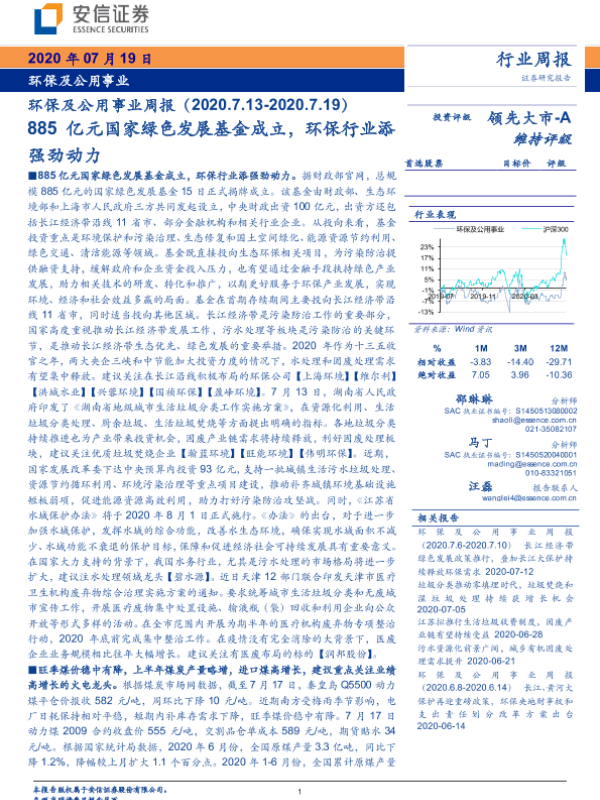 【安信证券】【20200719】环保及公用事业周报:885亿元国家绿色发展基金成立,环保行业添强劲动力-19页 行业研究