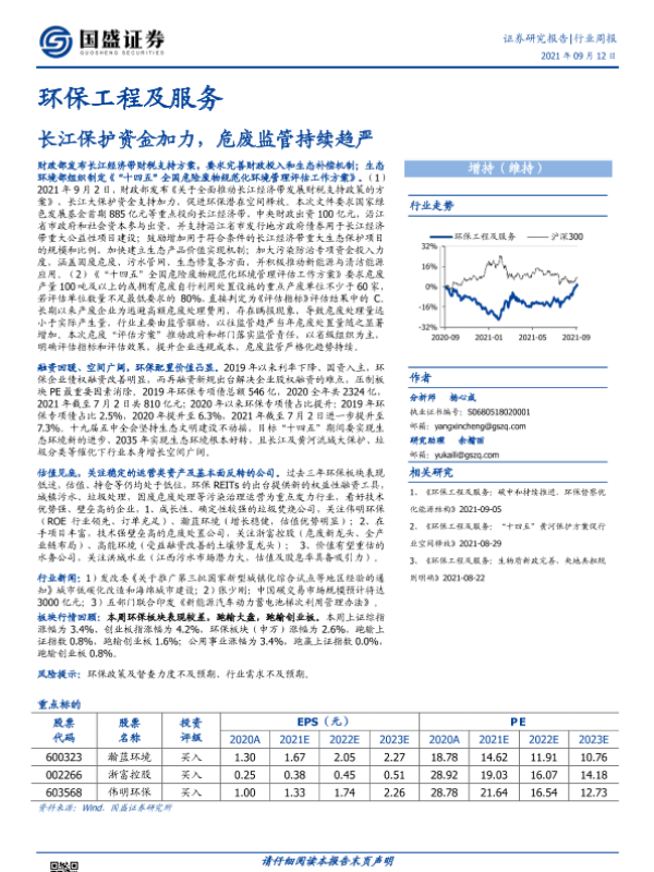 【国盛证券】【20210912】环保工程及服务行业周报:长江保护资金加力,危废监管持续趋严-13页 行业研究