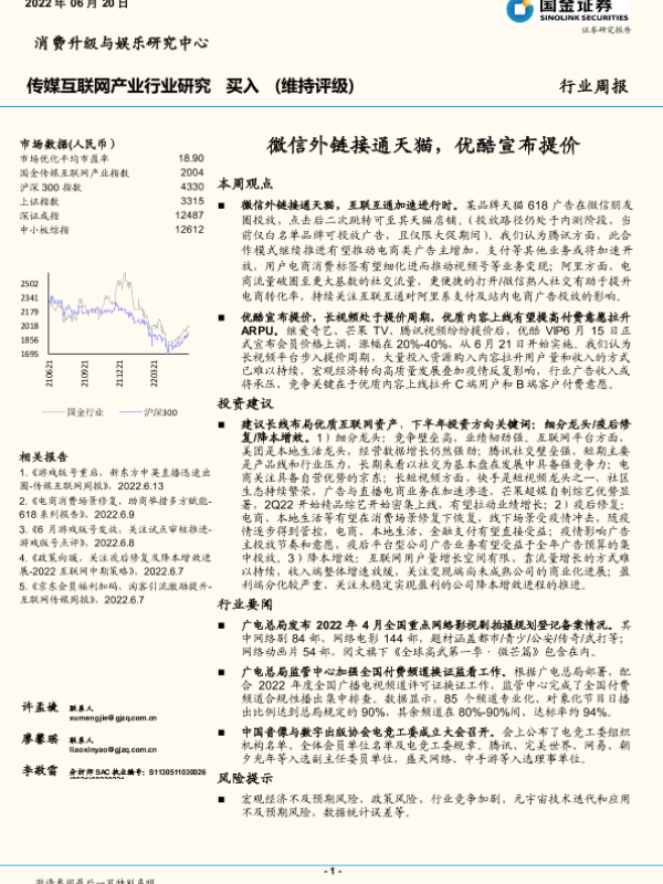 【国金证券】【20220620】传媒互联网产业行业周报:微信外链接通天猫,优酷宣布提价-17页 行业研究