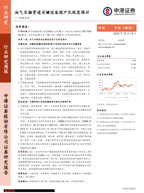 【申港证券】【20191014】油气长输管道关键设备国产化程度探讨-18页 行业研究