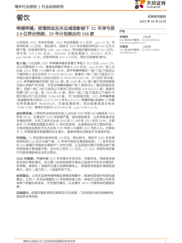 【天风证券】【20220403】呷哺呷哺:疫情扰动及关店减值影响下21年净亏损2.9亿符合预期,22年计划展店约156家-5页 行业研究