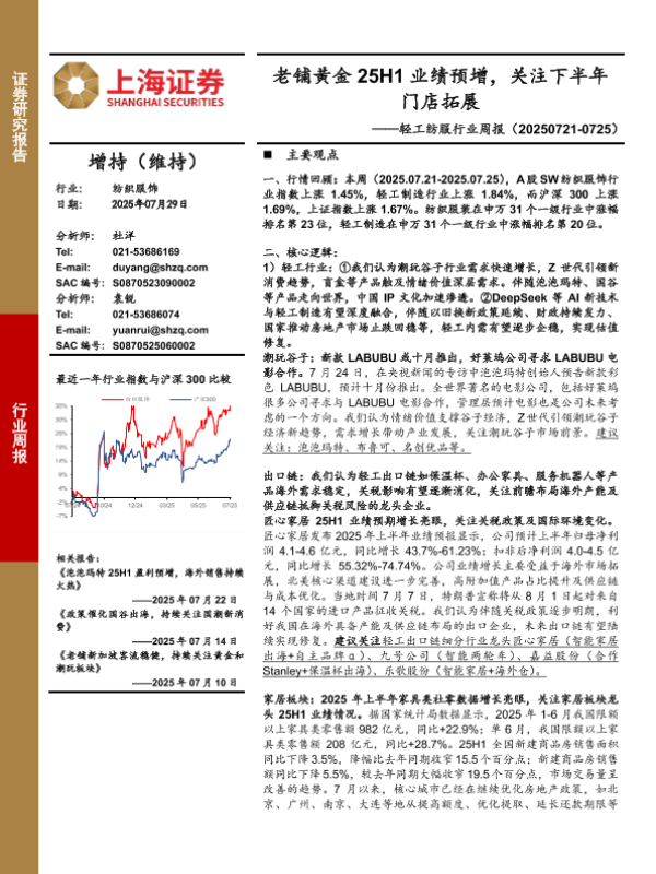 【上海证券】【20250729】轻工纺服行业周报_老铺黄金25H1业绩预增_关注下半年门店拓展-4页 证券期货研究报告