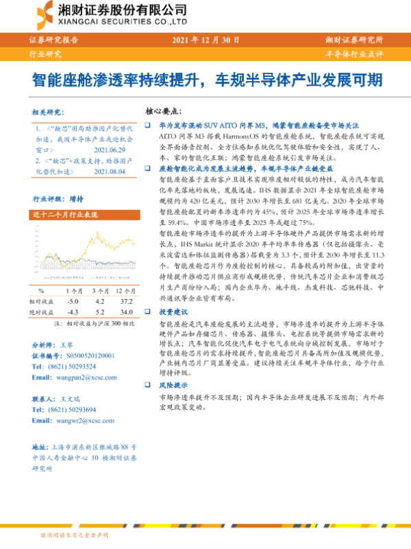 【湘财证券】【20211230】20211230-湘财证券-半导体行业点评:智能座舱渗透率持续提升,车规半导体产业发展可期-10页 行业研究