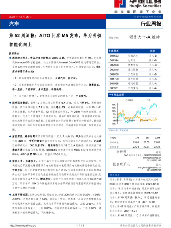 【华金证券】【20211226】汽车第52周周报:AITO问界M5发布,华为引领智能化向上-13页 行业研究