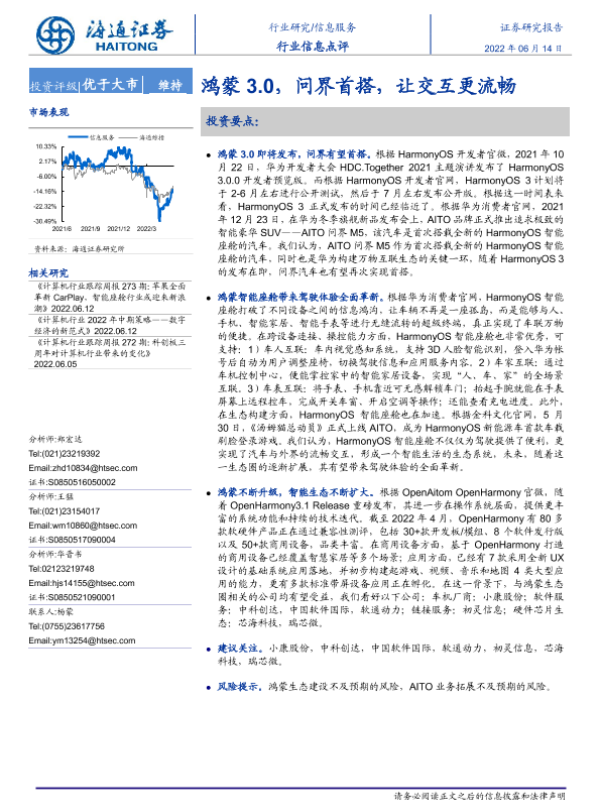 【海通证券】【20220614】20220614-海通证券-信息服务行业信息点评:鸿蒙3.0,问界首搭,让交互更流畅-8页 行业研究