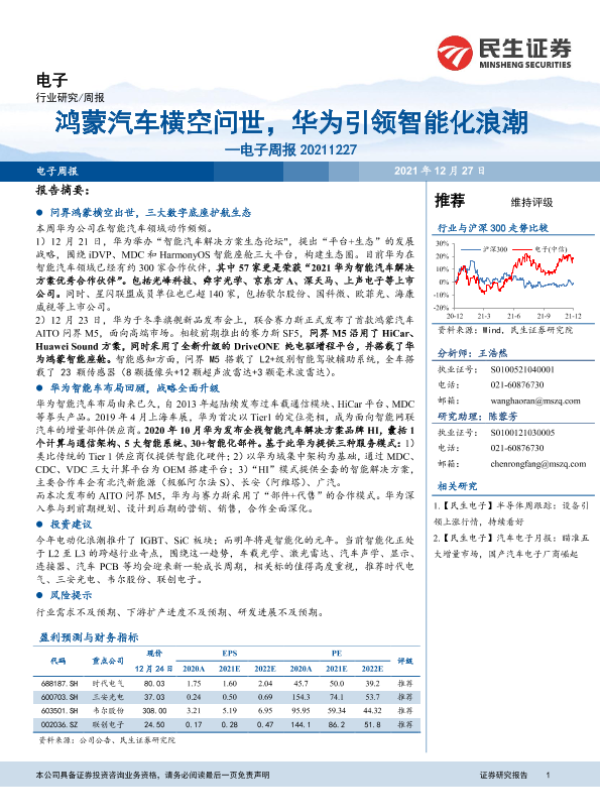 【民生证券】【20211227】20211227-民生证券-电子周报:鸿蒙汽车横空问世,华为引领智能化浪潮-8页 行业研究