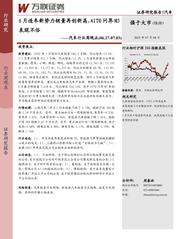【万联证券】【20220704】6月造车新势力销量再创新高,AITO问界M5表现不俗-12页 行业研究