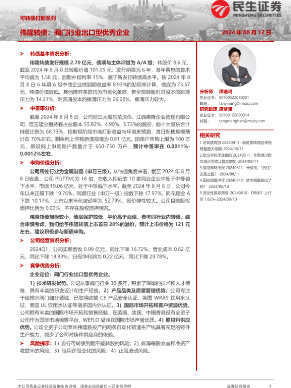 【民生证券】【20240812】可转债打新系列:伟隆转债,阀门行业出口型优秀企业-14页 行业研究