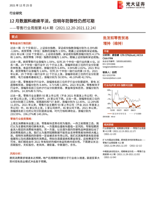 【光大证券】【20211225】零售行业周报第414期:12月数据料继续平淡,但明年防御性仍然可期-9页 行业研究