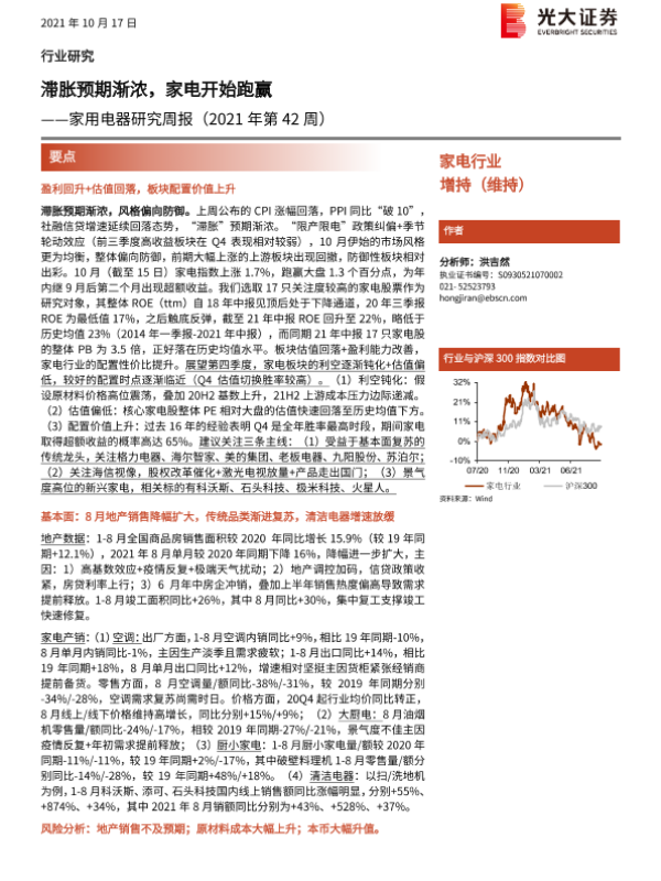 【光大证券】【20211017】家用电器研究周报(2021年第42周):滞胀预期渐浓,家电开始跑赢-27页 行业研究