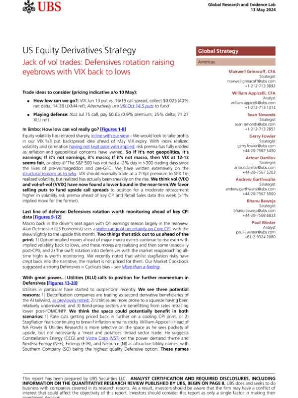 【UBS Securities LLC】【20240513】US Equity Derivatives Strategy _Jack of vol trades Defensives rotation raising eyebrows with VIX back to lows-12页 行业研究