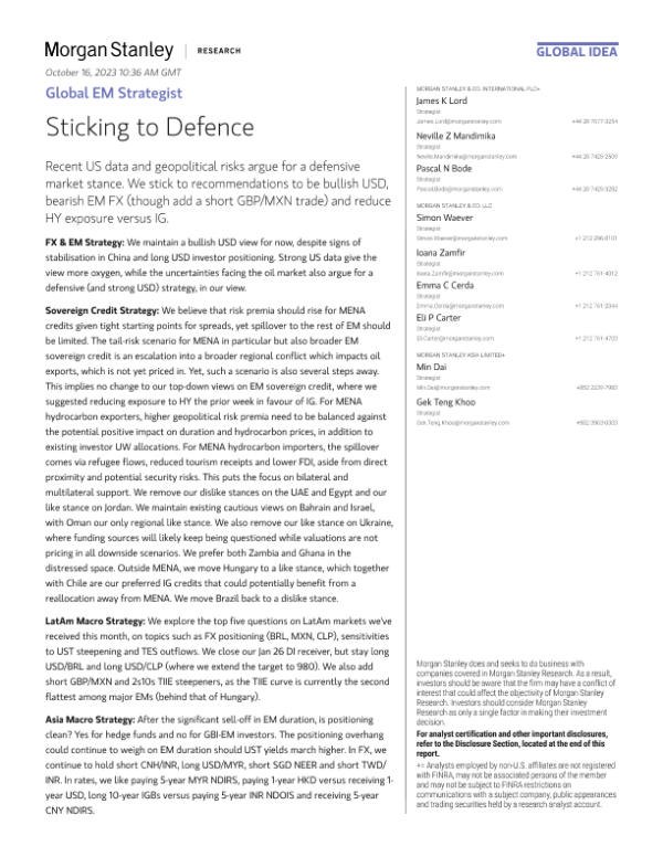 【Morgan Stanley】【2023】Morgan Stanley Fixed-Global EM Strategist Sticking to Defence-46页 宏观策略