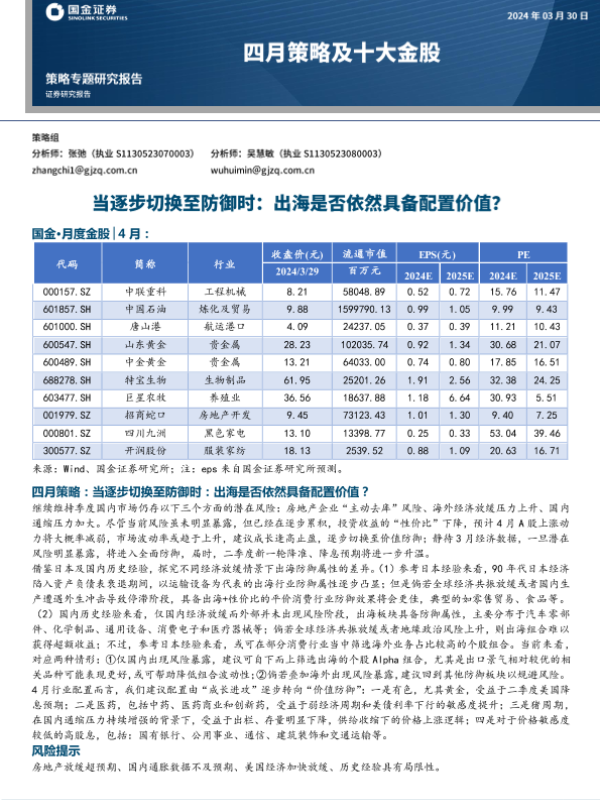 【国金证券】【20240330】四月策略及十大金股-当逐步切换至防御时:出海是否依然具备配置价值?-17页 行业研究