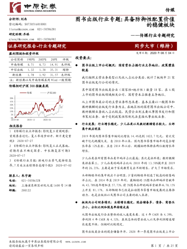 【中原证券】【20200804】20200804-中原证券-传媒行业专题研究:图书出版行业专题:具备防御性配置价值的稳健板块-25页 行业研究