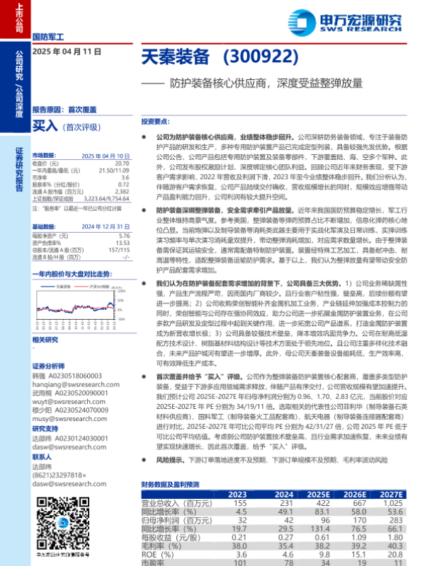 【申万宏源】【20250411】天秦装备(300922)防护装备核心供应商,深度受益整弹放量-26页 公司研究